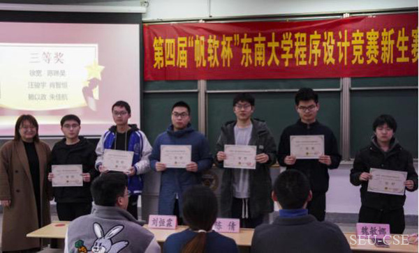 第四届“帆软杯”必威西汉姆联程序设计竞赛三等奖颁奖留影,左二、左三、左四分别为我基地朱佳航、肖智恒、汪骏宇同学